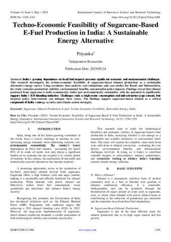 ., Priyanka (2025) Techno-Economic Feasibility of Sugarcane-Based E-Fuel Production in India: A Sustainable Energy Alternative. International Journal of Innovative Science and Research Technology, 10 (5): 25may1088. pp. 1356-1359. ISSN 2456-2165