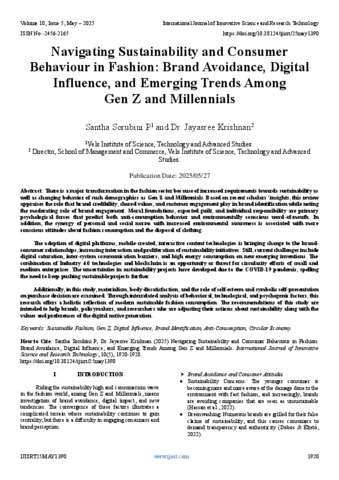 Sorubini P, Santha and Krishnan, Jayasree (2025) Navigating Sustainability and Consumer Behaviour in Fashion: Brand Avoidance, Digital Influence, and Emerging Trends Among Gen Z and Millennials. International Journal of Innovative Science and Research Technology, 10 (5): 25may1390. pp. 1920-1928. ISSN 2456-2165