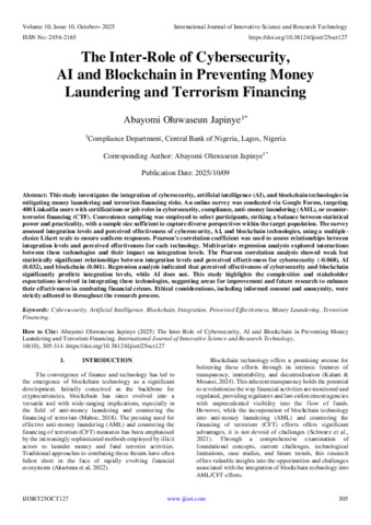 Japinye, Abayomi Oluwaseun (2025) The Inter-Role of Cybersecurity, AI and Blockchain in Preventing Money Laundering and Terrorism Financing. International Journal of Innovative Science and Research Technology, 10 (10): 25OCT127. pp. 305-314. ISSN 2456-2165