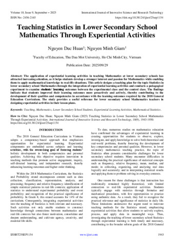 Huan, Nguyen Duc and Giam, Nguyen Minh (2025) Teaching Statistics in Lower Secondary School Mathematics Through Experiential Activities. International Journal of Innovative Science and Research Technology, 10 (9): 25SEP1154. pp. 1943-1950. ISSN 2456-2165